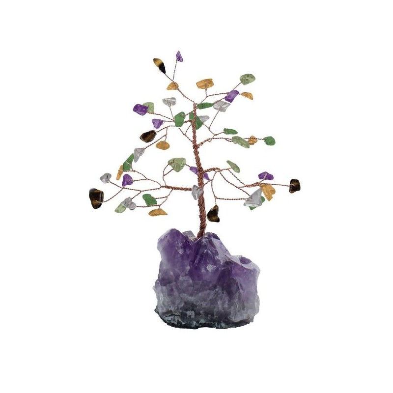 Arbre du Bonheur finement orné de pierres de Quartz multicolore montées sur un tronc en cuivre - Arbre du Bonheur multi-pierres composé de 15 branches, de 45 pierres percées : Améthyste, Cristal de Roche, Œil de Tigre, Aventurine, Citrine, d'un tronc en fil de cuivre et d'un socle en druse d'Améthyste. L'Arbre du Bonheur est le symbole de la vie, du lien entre la terre et l'infini céleste. Au-delà de son aspect décoratif, il aide au renouvellement des énergies d'un lieu. [CARACTÉRISTIQUES] Arbre en pierres naturelles et cuivre. Hauteur de l'arbre 8 cm. Diamètre de l'arbre 6 cm. [PACKAGING] Boîte en carton pliante avec fourreau imprimé. [PRÉCAUTIONS D'EMPLOI] Attention : les minéraux ne peuvent se substituer à un traitement médical. Les indications et propriétés décrites en lithothérapie se basent sur des effets généralement constatés, mais non vérifiés scientifiquement. Seul un médecin est habilité à faire un diagnostic et à prescrire un traitement.