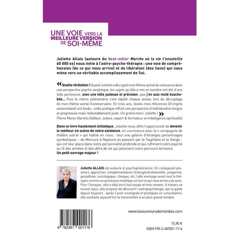 Juliette Allais (auteure du best-seller Marche où la vie t’ensoleille 60 000 ex), nous initie à l’astro-psycho-thérapie : une voie de compréhension (de ce qui nous arrive) et de libération (des liens) qui nous mène vers un véritable accomplissement de Soi. « Quelle révélation ! moi qui ne croyait pas à l’astrologie, j’en suis tombé de ma chaise ! Quand Juliette m’a fait la lecture psycho-analytique de mon thème astral de naissance, les sujets qu’elle a mis en lumière ont été d’une telle pertinence, avec une telle justesse et précision, que j’en suis resté bouche-bée… Mais le même phénomène s’est répété chaque année, lors du décryptage de mon thème astral d’anniversaire ! Toutes mes réticences (d’origine universitaire) ont fondu, et nos échanges ont ensuite modifié ma compréhension du monde et de ses mystères, et m’ont amené à voir autrement la notion d’’accomplissement de Soi. Un grand merci Juliette ! » Pierre Moniz-Barreto (auteur, éditeur, formateur spirituel). Dans ce livre hautement initiatique, Juliette nous offre l’opportunité de devenir le metteur en scène de notre existence, en connivence avec la compagnie de théâtre astral qui habite en nous : tout une galerie d’étranges personnages symboliques – de Mercure à Neptune en passant par le Sagittaire et la Vierge - qui ont leur place dans notre personnalité profonde et qui rythment notre psyché au fil des années et des défis de vie qui jalonnent notre parcours terrestre. Un petit ouvrage majeur.