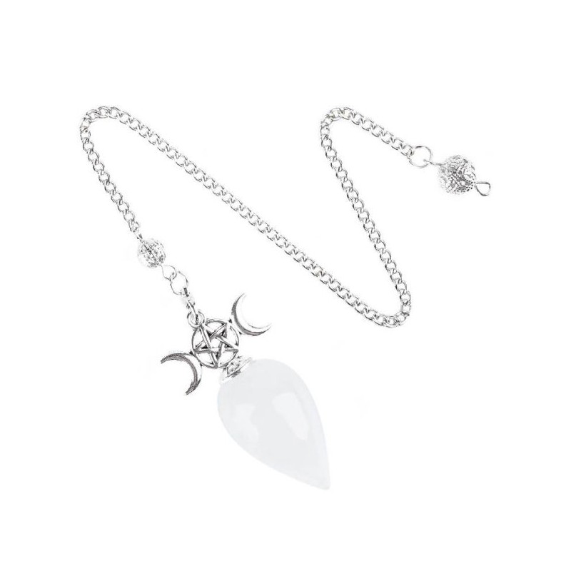 Pendule divinatoire en cristal de roche naturel, orné du symbole du Pentacle entouré de la Triple Lune, représentation traditionnelle associée aux cycles lunaires et à la protection spirituelle dans l’ésotérisme occidental.